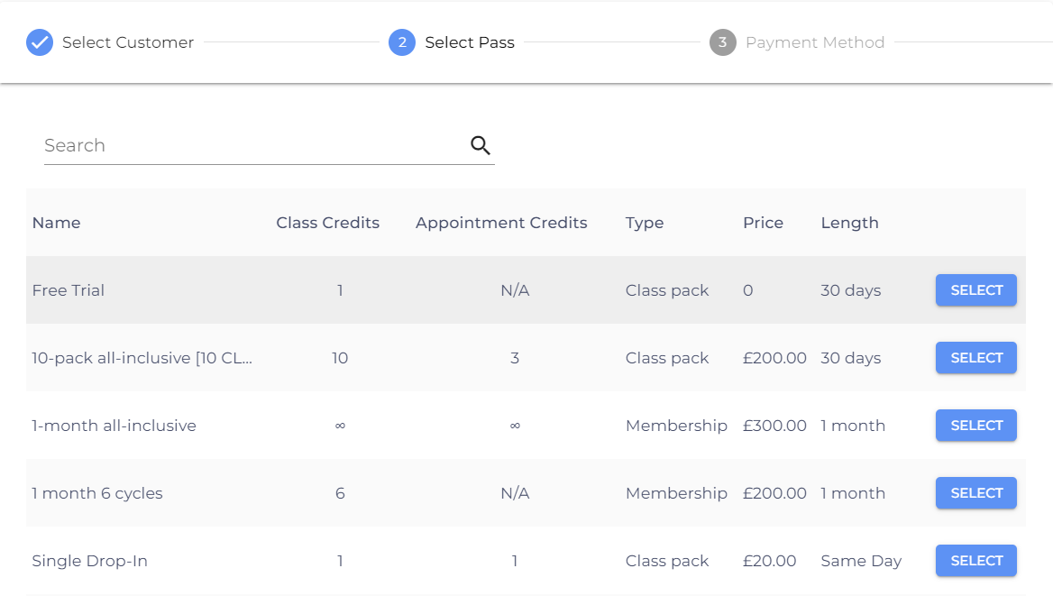 Here, you will find your customer database, from where you can search for the customer you want to assign the pass to, select and assign them the required pass.