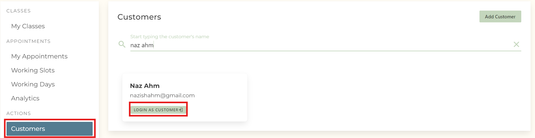 - Access the 'Customers' tab from the side menu, search for and click 'Login as Customer' on the required customer.