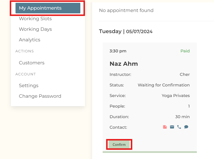 - After this, you can log out of the customer account, and access 'My Appointments' from the side menu to 'Confirm' the appointment (only if the appointment booked is for you AND if this feature is enabled by your Admin. Else, you will have to wait for your Admin to confirm the appointment).