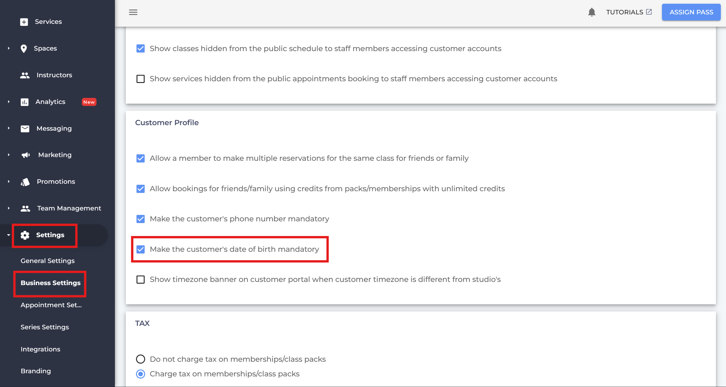 Making Date of Birth Mandatory To enable: Go to Settings → Business Settings Check 'Make the customer's date of birth mandatory' Scroll down and click Save