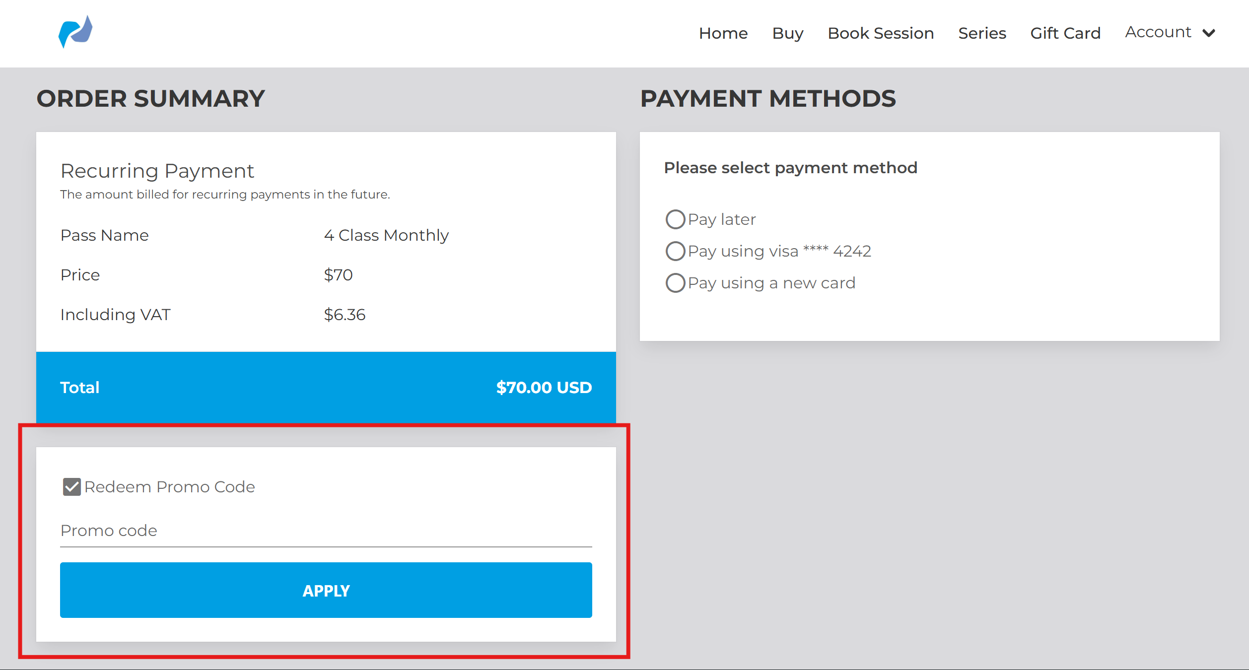 To redeem gift cards, the code needs to be applied in the "Redeem Promo Code" box at checkout.